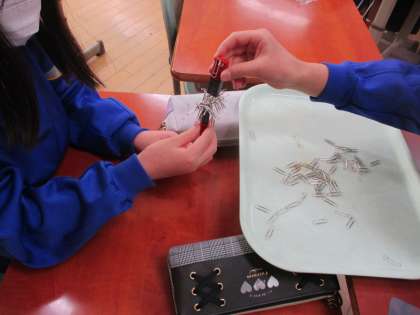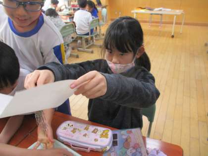 理科の学習で「じしゃくは、はなれていても鉄をひきつけるのか」の実験をしています。ぼうじしゃくにどのようにクリップがつくのか、また、ゼムクリップとじしゃくの間に紙や下敷きをはさみ、ゼムクリップの動きを真剣にみていました。間にはさむものをいろいろかえると、新たな発見もありました。