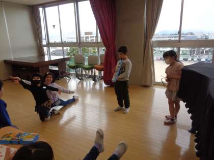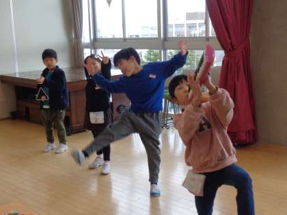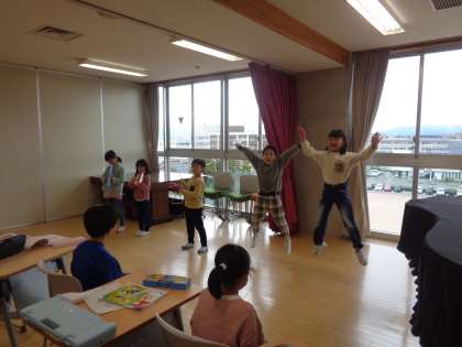グループごとに「とんくるりんぱんくるりん」の合奏とダンスを発表しました。