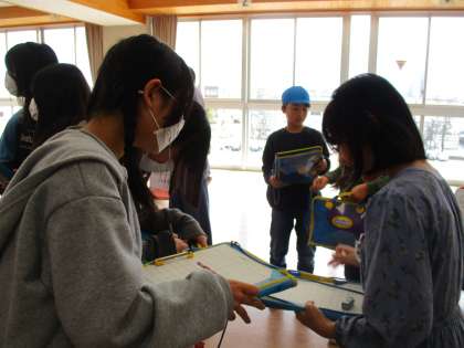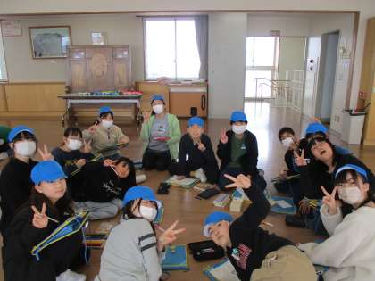 4年生の子供たちが企画してくれた、卒業お祝いイベントの第二弾が行われました。今回の内容は、みんなでイラストを描いて作品をつくる活動と、あいさつをした友達の名前をたくさん聞き合う活動です。4年生と6年生が円になって座ったり、あいさつをした友達とハイタッチしたりする姿は、とても和やかで楽しそうでした。最後には、メッセージ入りのチューリップの折り紙をもらい、6年生は嬉しそうにしていました。