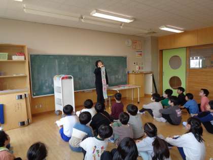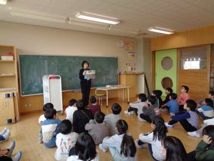 図書オリエンテーションで、紙芝居を読んでもらったり、百科事典のひき方を教えてもらったりしました。読書が好きな4年生。今年も、たくさん図書室を利用したいとワクワクしています。