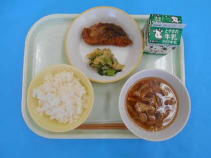 今日のメニューは、ごはん、ぎゅうにゅう、さわにわん、おひたし、さかなのたつたあげです。からっとあがったたつたあげ、お魚をおいしくいただきました。