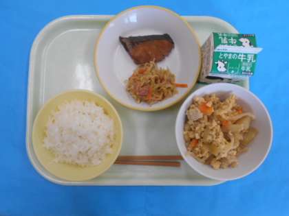 今日のメニューは、ごはん、ぎゅうにゅう、たまごとじ、はりはりソテー、ふくらぎのてりやきです。たまごとじにはこうやどうふが入っており、味がよくしみていました。