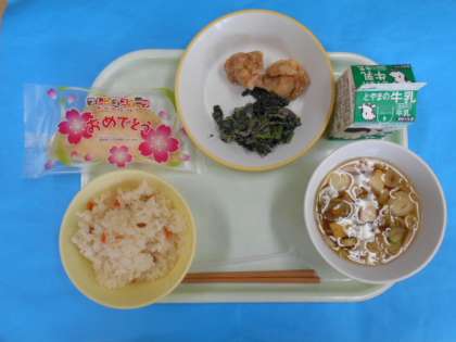 今日のメニューは、ちらしずし、ぎゅうにゅう、すましじる、とりのからあげ、よごし、おいわいデザートでした。一年生の入学をお祝いするとくべつメニューです。一年生のみなさん、あらためておめでとう!