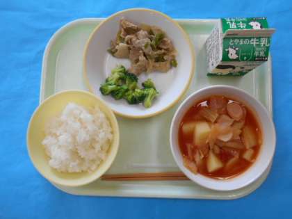 今日のメニューは、ごはん、ぎゅうにゅう、しろいんげんまめのトマトに、ゆでブロッコリー、ポークソテーです。しろいんげんまめがトマトスープとあい、とてもおいしかったです。