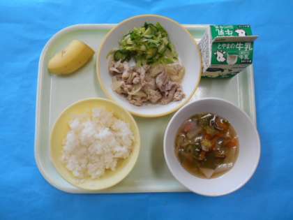 今日のメニューは、ごはん、ぎゅうにゅう、ワンタンスープ、きざみあえ、ぶたにくのしおこうじいため、バナナです。給食の放送で、「バナナを一番生産している国はどこでしょう。1番インド、2番フィリピン、3番台湾」というクイズが出ました。答えは、お子さんにお聞きください。