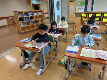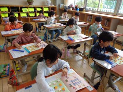 算数ボックスが揃い、早速ブロックを使って数の学習をしました。絵の上にブロックを置いて数を確かめたり、どちらが多いか比較したりしました。
