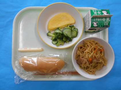 今日のメニューは、コッペパン、ぎゅうにゅう、やきそば、ドレッシングサラダ、オムレツです。やきそばは大人気で、おかわりをしていう子供たちが多くいました。
