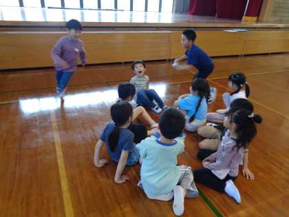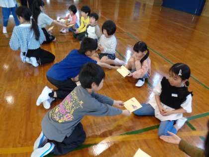 2年生さんが「にしっこ なかよし しゅうかい」に招待してくれました。体をつかったじゃんけんやはんかち落としをしたり、学校探検でクイズを出してもらったりして、2年生さんと一緒に楽しい時間をすごしました。最後には、花の種のプレゼントをもらい、1年生はとても嬉しそうにしていました。