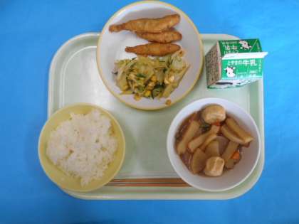 今日のメニューは、ごはん、ぎゅうにゅう、かんとうだき、わかさぎのフリッター、みずなのサラダです。カリッとあがったフリッターをおいしくいただきました。