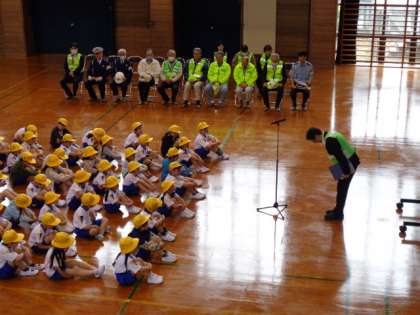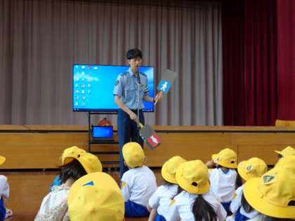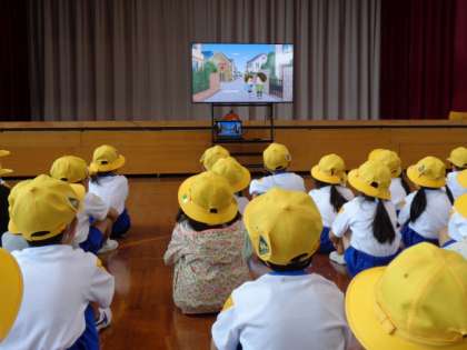 今日は、警察署の方、毎日の登下校時に子供たちの安全を見守ってくださっている方々に来ていただき、交通安全教室を行いました。道路で起こりうる危険な出来事、安全な歩行について、警察署の方の話やDVDの視聴で確かめました。