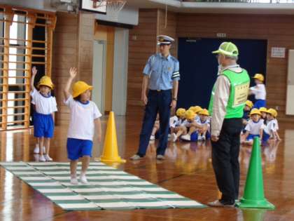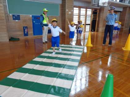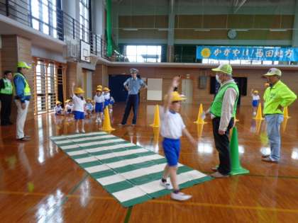 雨天のため、体育館に横断歩道のシートを敷いて、一人ずつ歩きながら、警察署の方の話やDVDの視聴で確かめた安全な歩行や横断の仕方を実践しました。子供たちは見守り隊の方々の注意を聞きながら、真剣に横断の練習をしていました。