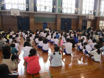 今日は、理科室から出火した想定で訓練をしました。「お・は・し・も」を守って、静かに素早く体育館に避難することができました。
