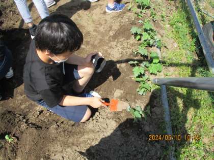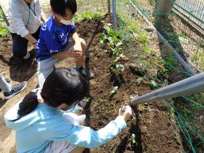 理科の学習で、植物の成長とあたたかさの関係を調べています。ヘチマの苗を観察した後、畑に植え替えました。どのように育つが楽しみです。