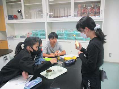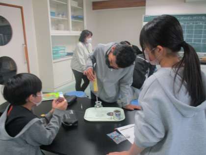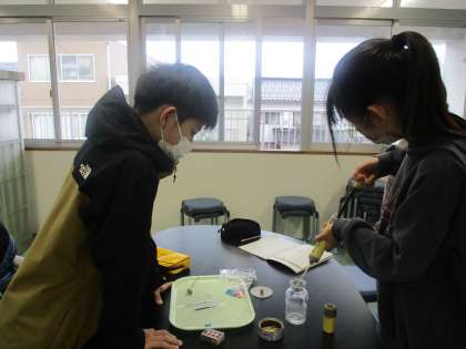 理科の授業では、燃えたあとの空気について詳しく調べています。この実験では気体検知管を使います。初めて使う実験器具でしたが、子供たちはすぐに使いこなしているようでした。写真は1組の様子です。