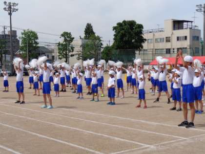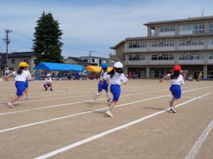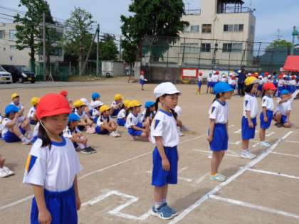 運動会の予行練習を行いました。子供たちは、高学年のお姉さんお兄さんに声をかけてもらいながら、お茶を飲んで水分補給したり、1年生の出番が近付くと並んだりしました。