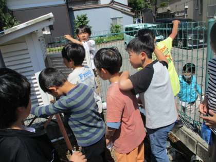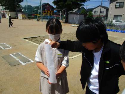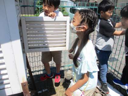 理科の学習で、1日の気温の変わり方は、天気によって違いはあるのかについて、観察をはじめています。まず、気温のいろいろなはかり方について学習しました。グラウンドの端にある「百葉箱」をみつけて、扉をあけると・・・。温度計があることを初めて知った子供たちです。次に、1日に何度か気温をはかる場所を決めました。晴れ、くもり、雨の日に気温の変わり方に違いはあるのでしょうか。