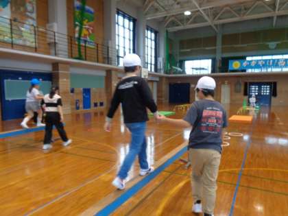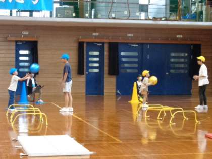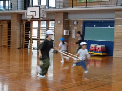 6年生がもっと仲よくなるために遊びに誘ってくれました。1時間目に迎えに来てくれるとのことで、いつも以上に朝の準備を早く終え、わくわくそわそわしていました。今日のゲームは、色団対抗の巧緻走やフラフープリレーでした。6年生とペアになって、元気に体を動かしていました。