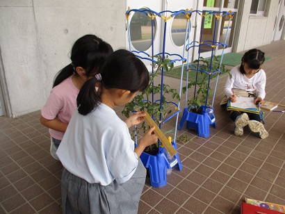 育てている野菜の観察をしました。「前回と比べて葉が増えたよ」「小さな実ができているよ」と、生長を感じていました。