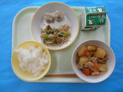 今日のメニューは、ごはん、ぎゅうにゅう、にくシューマイ、こうみあえ、ちくぜんだきです。ちくぜんだきには、たけのこやほししいたけなどいろいろなやさいがにこまれており、おいしくいただきました。