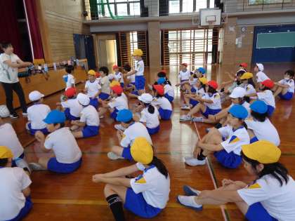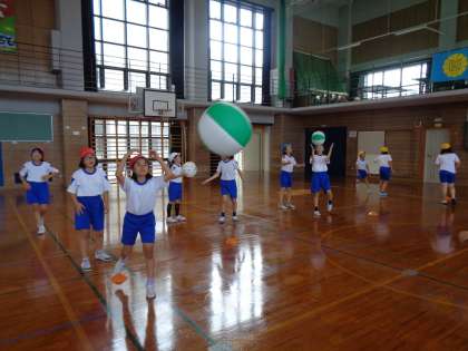 体育の時間に「キャッチバレーボール」をしています。まずは、ビーチボールを使って、練習。トスやレシーブの仕方をみんなでやってみました。その後、対面でボールパスをしましたが、思ったところにボールがいきません。それでも、笑顔で活動している子供たちです。