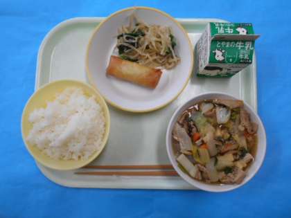 今日のメニューは、ごはん、ぎゅうにゅう、はっぽうさい、しおナムル、はるまきです。6月もおいしいきゅうしょくをたべて、元気にすごしてほしいと思います。