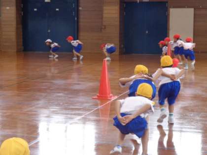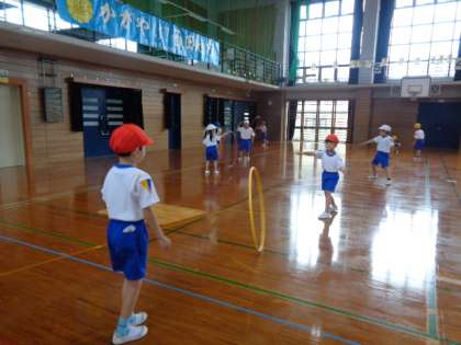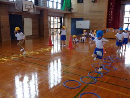 「多様な動きの運動遊び」として、スキップや横ステップ、ケンケンパ、反復横跳び、上体起こし等、様々な動きの運動遊びをしています。方法を覚えて取り組むことにも少しずつ慣れてきました。