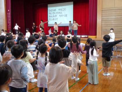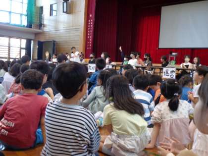 本校伝統の「立志児童総会」が行われました。高学年だけが委員会の運営に携わるのではなく、全校みんなで西田地方小学校を盛り上げていこうとするための会です。各委員会の取組に対して様々な質疑応答が行われ、低学年からも質問が上がっていました。また、伝統の「立志児童総会の歌」に合わせての合唱と踊りも行われ、1年生も元気に参加していました。