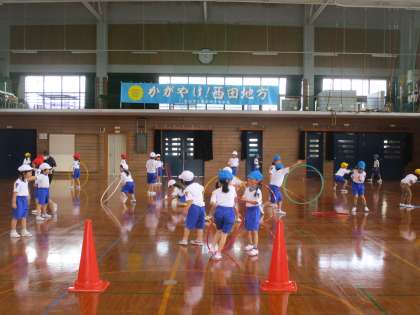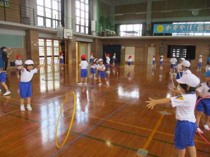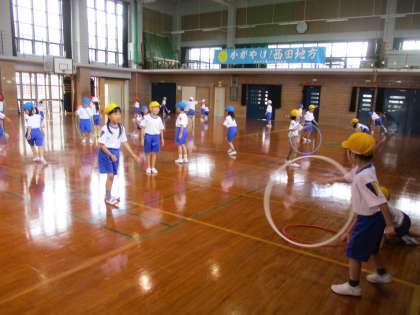 「多様な動きの運動遊び」では、道具を使った動きに挑戦しました。フラフープ転がしでは、どうしたらペアの友達のところへ真っ直ぐ転がすことができるかを考え、楽しみながら運動に取り組みました。