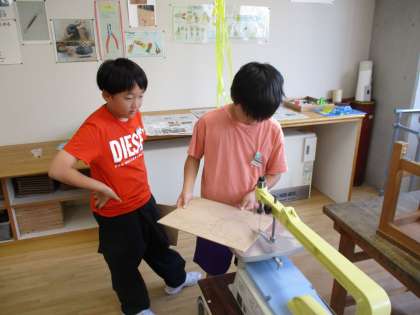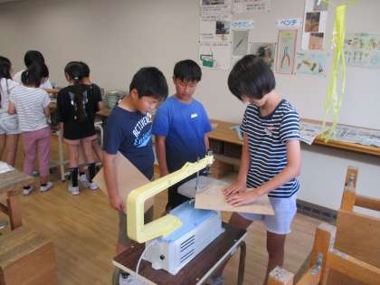 図工では、糸鋸を使ってメッセージボードを作成しています。自分の思い通りの形になるように細かく向きを変えたり、丁寧に動かしたりしながら作品をつくっています。