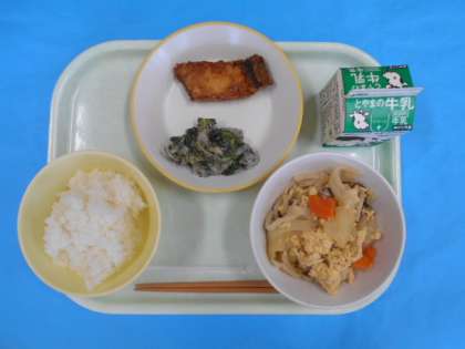 今日のメニューは、ごはん、ぎゅうにゅう、さかなのたつたあげ、よごし、たまごとじです。とやまのきょうどりょうり、よごしは、ごまのふうみがよくきき、やさいのえいようもアップします。