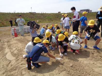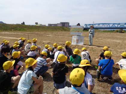 みなさん、富山市の花は何か知っていますか?県花はチューリップと認知度は高いですよね。富山市の花はひまわりです!今日は、ひまわりの種まきを通して、富山市のよさを広めるプロジェクトに参加してきました。校長先生や教頭先生に元気よくあいさつをして、神通川の緑地公園まで、バスで移動しました。地域のボランティアの方に丁寧に教わりながら、種まきを楽しみました。