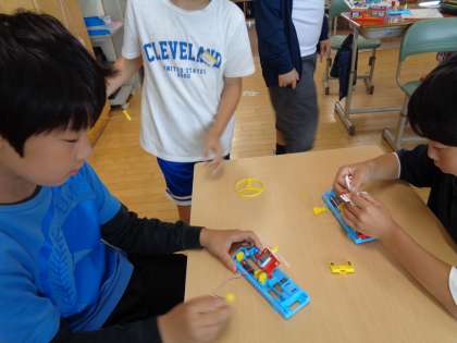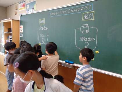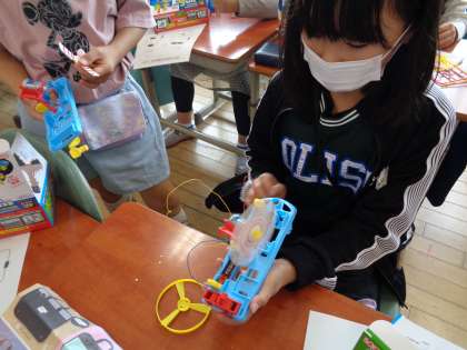 理科の時間に「電流のはたらき」について学習しています。プロペラが速く回るのは、直列つなぎか並列つなぎのどちらかを予想してから実験を行いました。はじめは並列つなぎ。「まぁまぁ速いね」といいながら、直列つなぎをすると「おぉ、速い」「すごい、目が回る」といいながら、つなぎ方と速さの違いを実感していました。