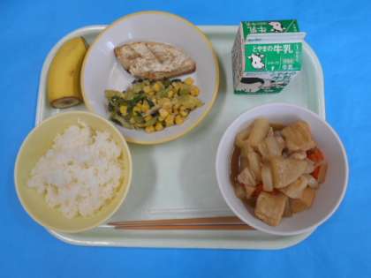 今日のメニューは、ごはん、ぎゅうにゅう、さばのしおやき、チンゲンサイソテー、とりにくとこんさいのにもの、バナナです。さばのしおやきは、さばのあまみがひきたてられ、とてもおいしくいただきました。