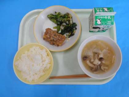 今日の給食は、ごはん、ぎゅうにゅう、あげだしどうふのにくみそかけ、いそあえ、みそしるです。あげだしどうふとにくみそがとてもよいあい、おいしくいただきました。