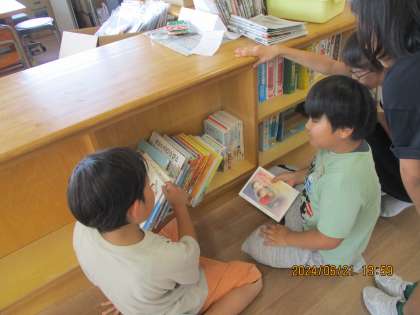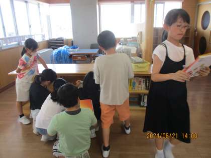 国語科の一つの花の学習では、登場人物の気持ちの変化や性格、情景について考えています。学年のメディアコーナーには、さまざまな戦争に関する本が置かれ、子供たちは手に取りじっくり読んでいました。