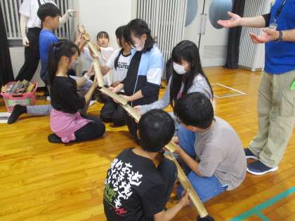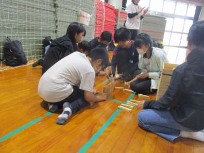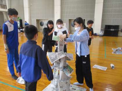 午前中は新聞紙タワー、ドミノ倒し、パイプラインの3種目を班対抗で楽しみました。
