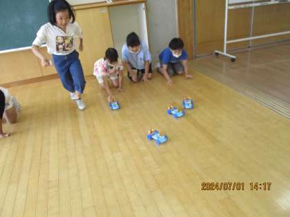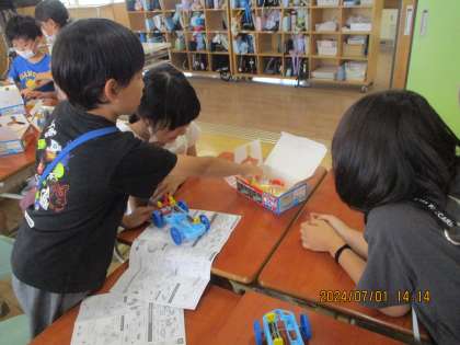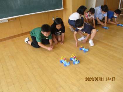 電流のはたらきの学習では、乾電池で動くプロペラカーを作って動かしてみました。乾電池のつなぎ方を変えると、走り方がどのように変わるか、調べていました。