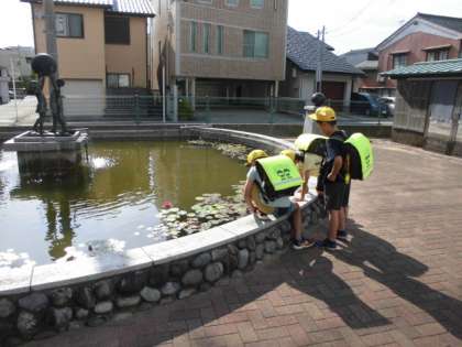 池の周りは、生き物好きの子供たちでいつも賑わっています。魚たちもずいぶん大きくなりました。メダカの稚魚がたくさん生まれ、すくすくと育っています。