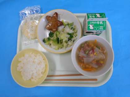 今日のメニューは、ごはん、ぎゅうにゅう、あまのがわスープ、そえやさい、ほしがたハンバーグです。たなばたこんだての日で、目にも楽しいこんだてに子供たちは喜んでいただいていました。