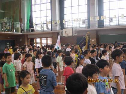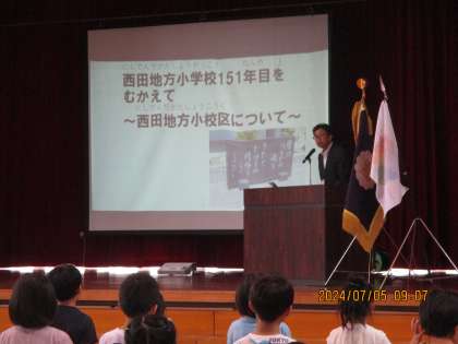 西田地方小学校が創校151周年を迎えました。代表の6年生2人が校旗を掲げて入場しました。子供たちは、その勇ましい姿をしっかりと目に焼き付けていました。