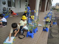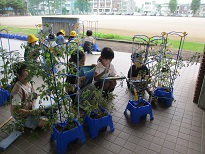 育ててきた夏野菜の観察をしました。実の付き方や数、色、大きさ等を調べながら、野菜の生長を感じていました。