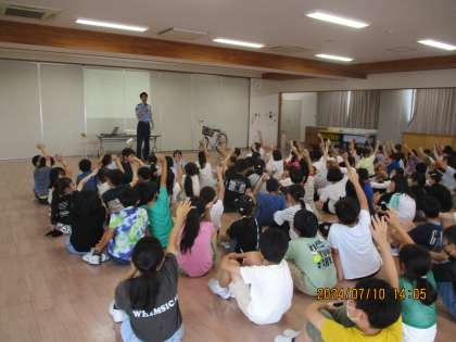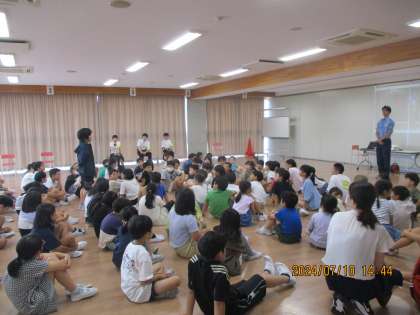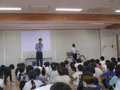 今日は3年生と合同で、交通安全教室に参加しました。警察署の方と中学生のお兄さんお姉さんが来てくださいました。自転車の安全な乗り方を教えていただいたり、交通安全に関するDVDを鑑賞したりしました。