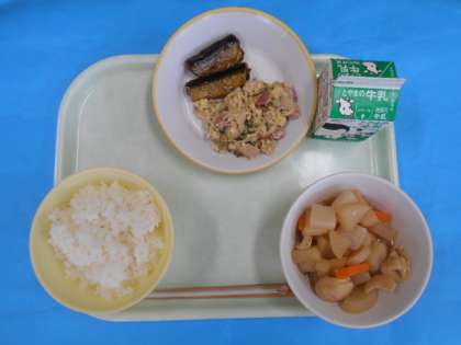 今日のメニューは、ごはん、ぎゅうにゅう、たきあわせ、ベーコンとゴーヤのたまごいため、いわしのうめにです。ゴーヤのちょっとしたにがみが、夏をかんじさせてくれました。