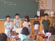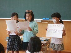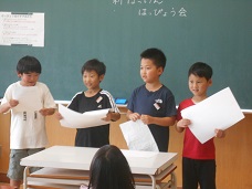 今日は町探検の発表会の2日目です。1学期は、12の店の新発見をしました。