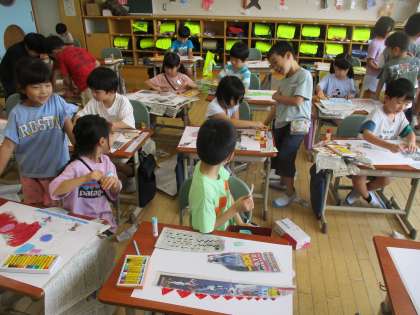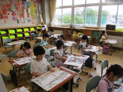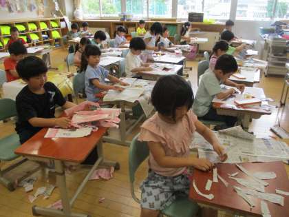 図画工作科「やぶいたかたちから うまれたよ」では、新聞紙やチラシを破いて偶然できた形が何に見えるか、想像力を働かせながら作品をつくりました。「いるかみたいな形になった!」「ロケットに見えるよ!」など、見付けた形について、友達と見せ合い、楽しみながら活動していました。