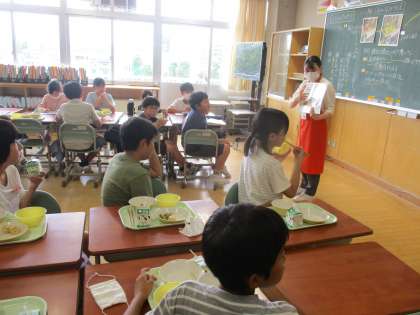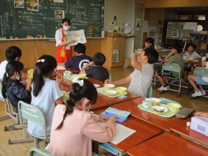 給食時間、栄養職員さんに食事の大切さについてお話をしていただきました。楽しみにしている子供が多い給食の栄養素について、改めてみんなで考えました。バランスよく食べ、元気に学校生活を送ってほしいです。