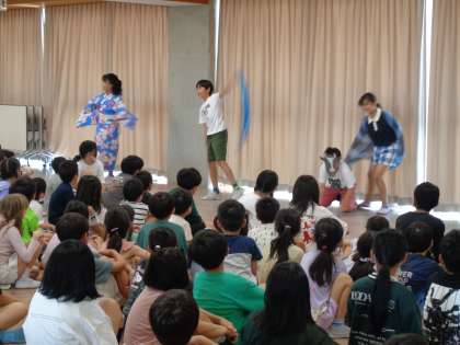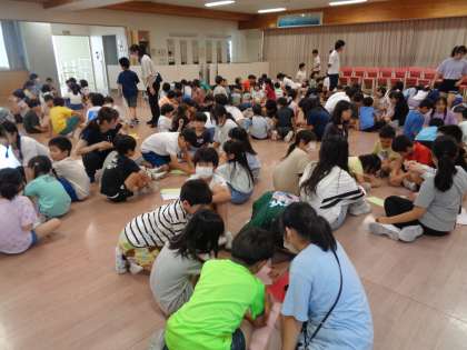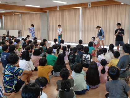 1学期の全校集会は「七夕」をテーマにしました。七夕の由来についてのミニ劇や、本物は誰だクイズをしました。クイズは「ひこ星」「おり姫星」に扮した4人が自己紹介をし、その台詞から本物を当てる内容です。また、縦割り班で配られた短冊に1人1人が願いを書きました。久しぶりに全員で集まり、笑いあり、交流ありの楽しい時間となりました。