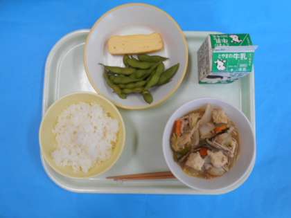 今日のメニューは、ごはん、ぎゅうにゅう、えだまめ、あつやきたまご、かんこくふうすきやきです。今日は1がっきさいごのきゅうしょくでした。もりもり食べ、こころもからだも大きくなった西っ子です。