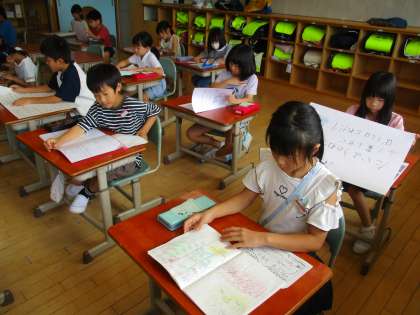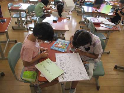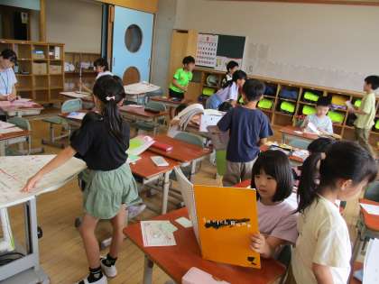 夏休みに取り組んだ自由研究を友達と見合い、感想を交換しました。友達の作品に興味をもって見たり読んだりしていました。