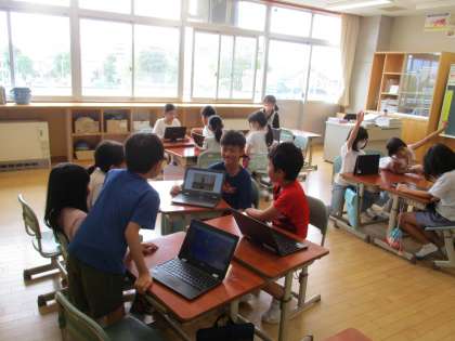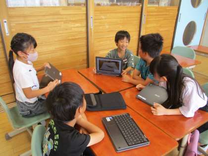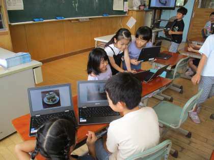 夏休みに一人一台端末で撮影してきた思い出の写真を、友達と見せ合いました。写真について話す姿から、楽しそうな様子が伝わってきました。